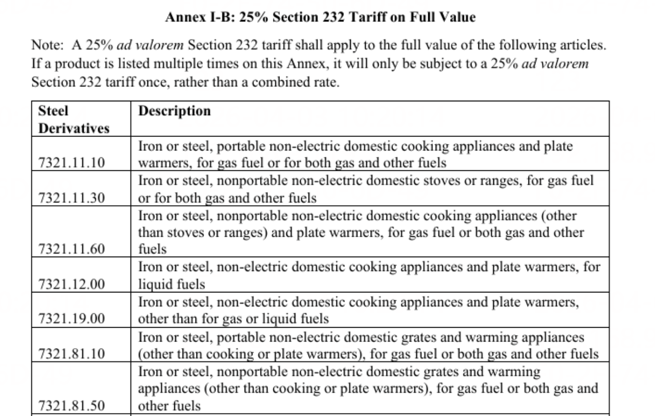 看似这类产品税率从50%下调至25%,但由于从“按金属含量”征税调整为“按整件商品总价值”征收,基数扩大了,实际交的税可能反而更多。注意,目前美国海关严查,低报货值将面临极大的扣关风险。