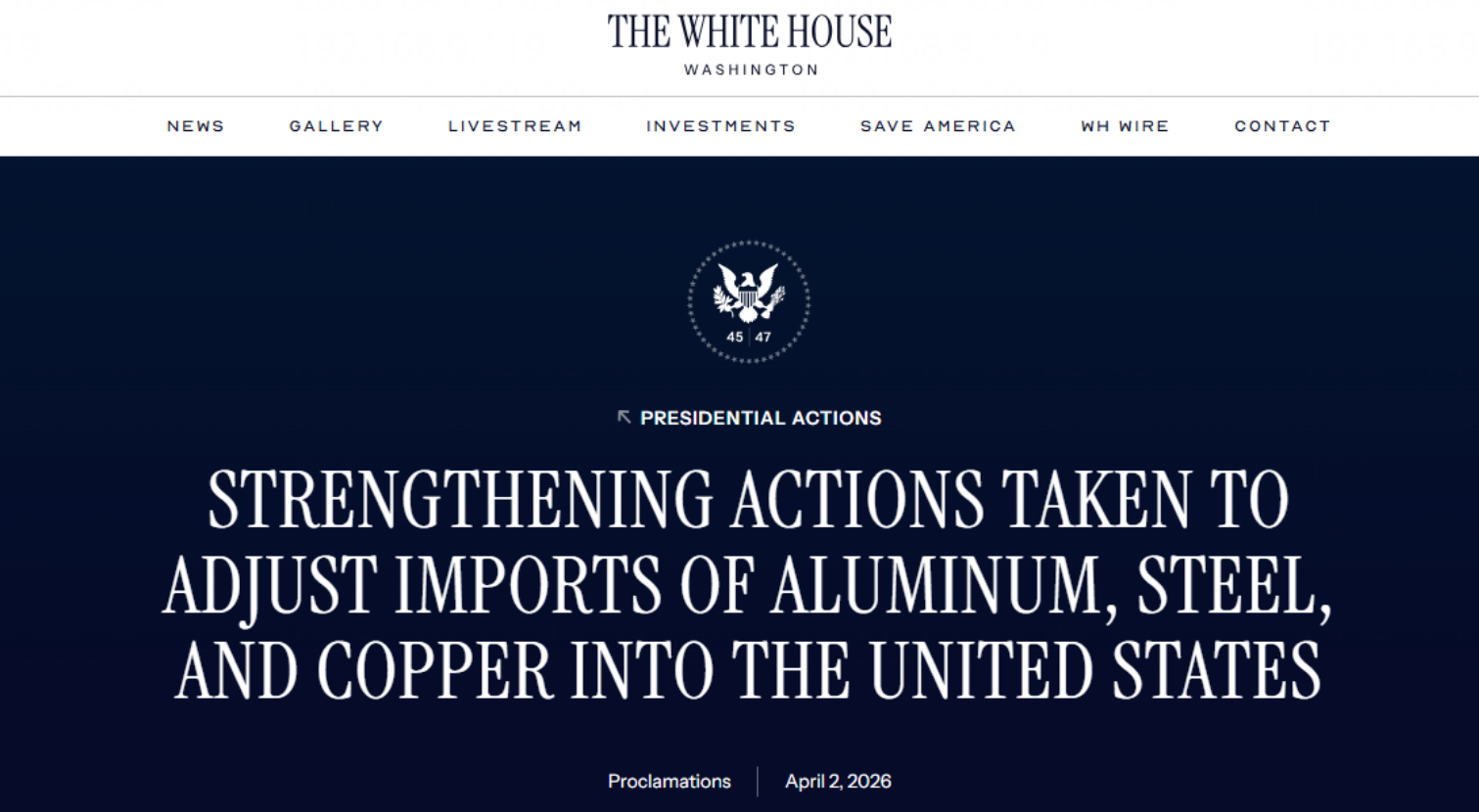 近期,美国白宫公布最新行政令,对进口钢、铝、铜及其相关衍生品的关税规则进行调整,已于2026年4月6日正式生效。