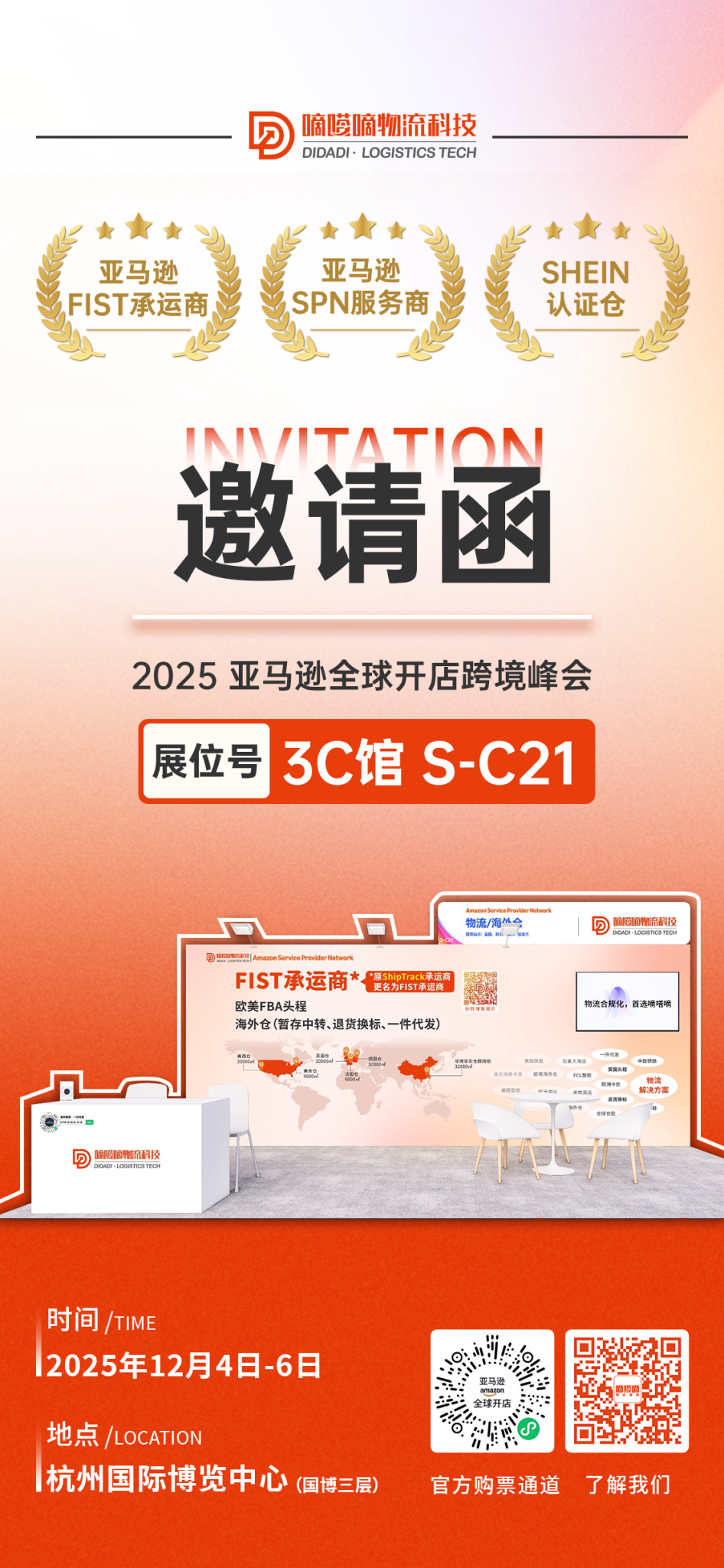 2025亚马逊全球开店跨境峰会将于2025年12月4日至6日在杭州国际博览中心隆重举办,嘀嗒嘀物流科技受邀将亮相展会,诚挚邀请各位跨境卖家朋友们莅临我们展位参观交流!