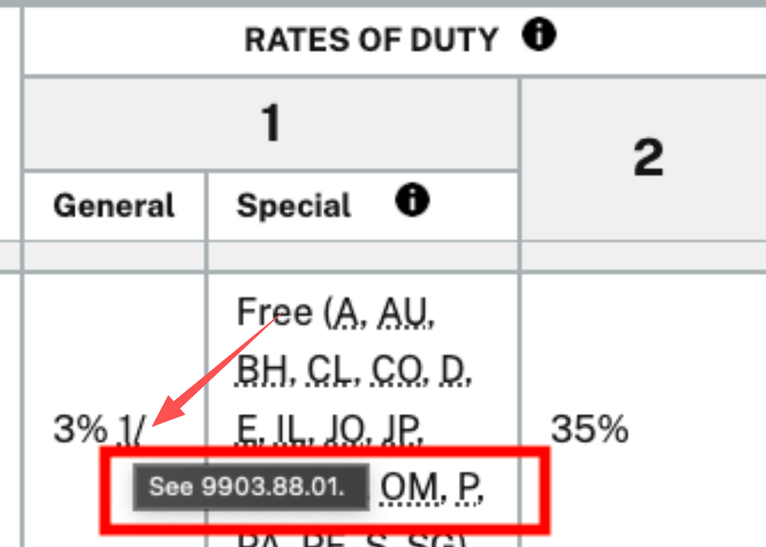 在“Rates of Duty”一栏中,找到“General”列,这里显示的 3% 就是该产品的基础税率。