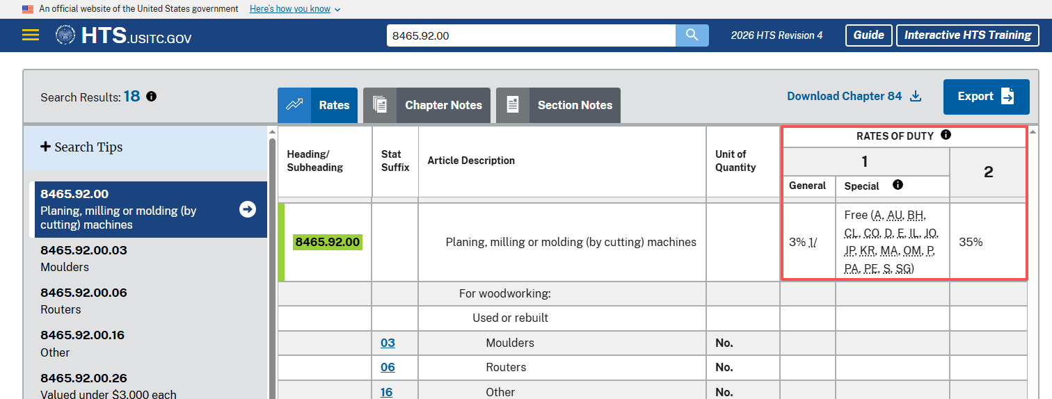 我们举例的HTS编码 8465.92.00(木材加工机床)最终税率 = 3% (基础税率) + 25% (301关税) + 10% (122关税) = 38%
