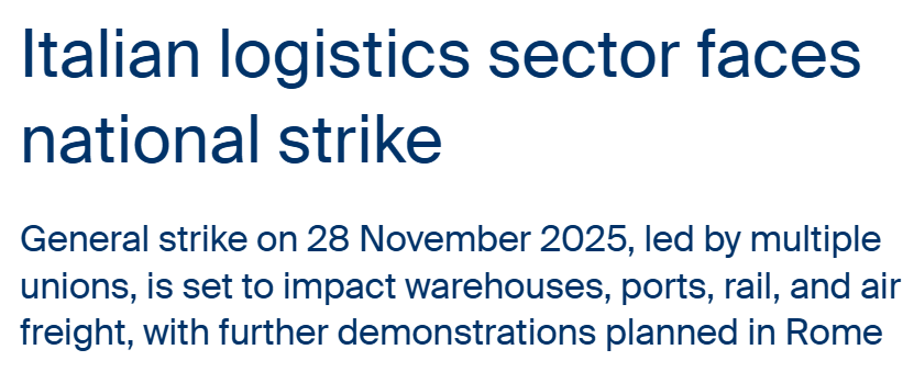 就在这两天,据德迅及多家欧洲当地新闻机构发布的预警:由意大利基层工会联盟(Unione Sindacale di Base)以及意大利工会联合会(CUB)和意大利基层工会联盟(COBAS)等其他意大利基层工会已联合宣布:意大利计划于11月28日(本周五)举行一场24小时全国性的总罢工。这个时间正是黑五旺季销售期间,搞这么一出,真难受啊!